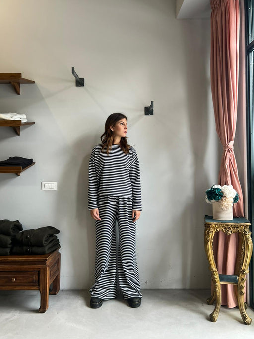Solo 1 in magazzino!Pantapalazzo non troppo ampi con elastico in vita, non hanno le tasche.Cuciti in cotone garzato a righe blu e bianche.Composizione tessuto 95% coto...