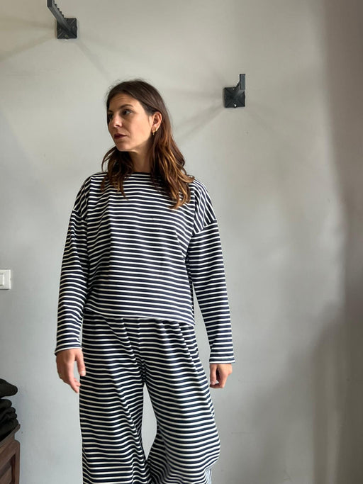 Solo 2 in magazzino!Felpa dal taglio a scatoletta con maniche lunghe e scollo a barchetta,cucita in felpa garzata di cotone a righe blu e bianche.Composizione tessuto ...