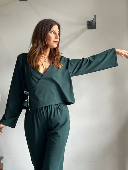 6 in magazzinoScaldacuore con maniche lunghe e larghe, scollo a V con chiusura a portafoglio;si chiude sovrapponendo i lembi di tessuto e legando i laccetti. Cuc...
