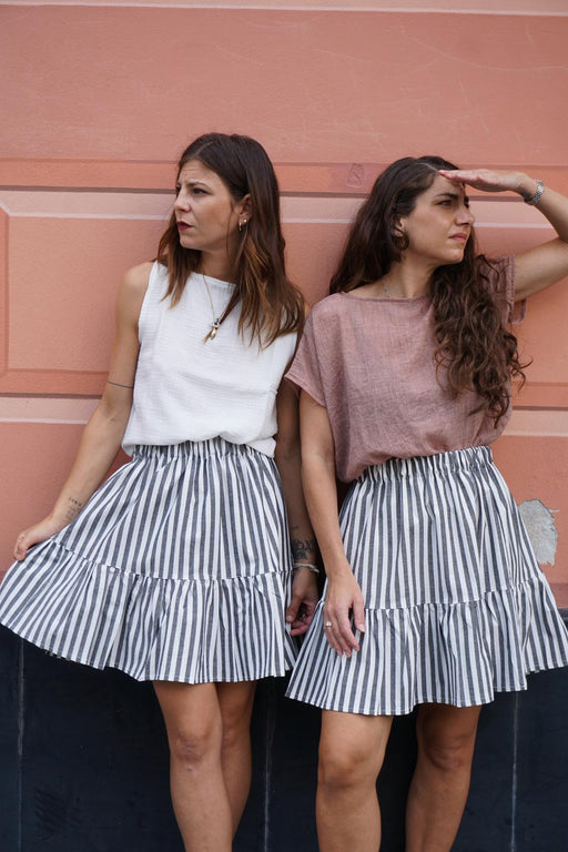 Solo 3 in magazzino!Gonna corta dal taglio leggermente svasato, senza tasche, elastici, bottoni o zip.Cucita in maglia di cotone color biscotto a righe sottili nere.C...