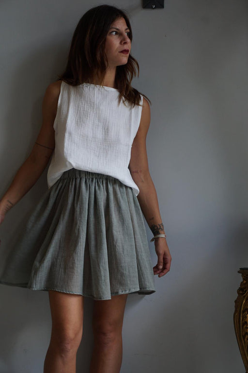 10 in magazzinoGonna corta incrociata a portafoglio.Non ha l’asola di passaggio della cintura, il girovita si regola sovrapponendo i due lati.Cucita in twill mist...