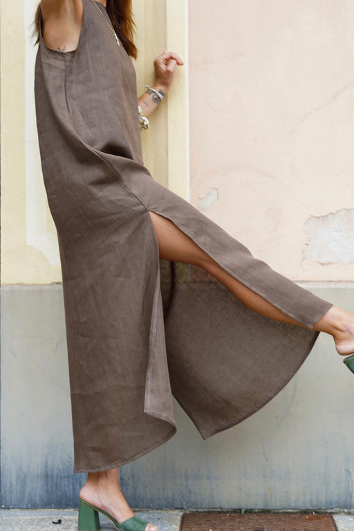 Solo 3 in magazzino!Abito lungo leggermente svasato sul fondo con spacco laterale, scollo a barchetta e maniche lunghe a campana.Cucita in jersey di cotone in colore m...