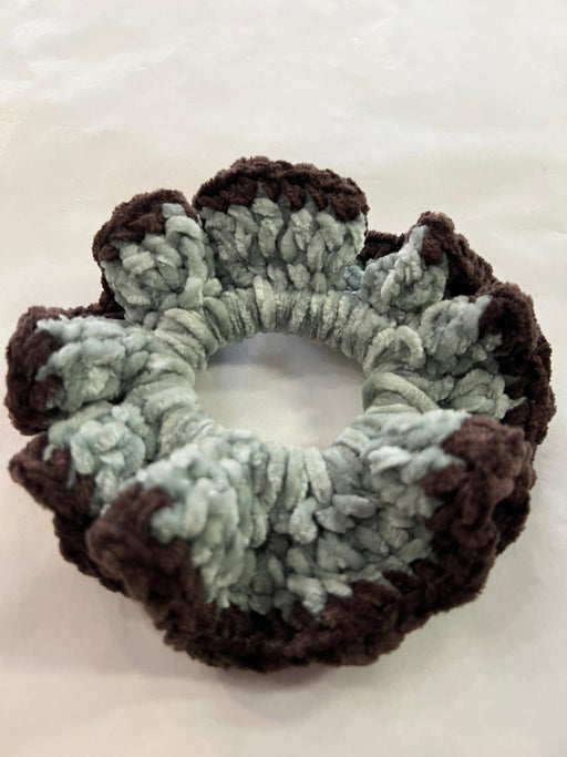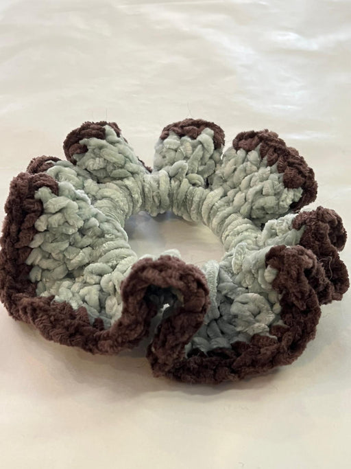Solo 1 in magazzino!Fifì per capelli in ciniglia verde acqua con bordino marrone. Diametro 12 cm