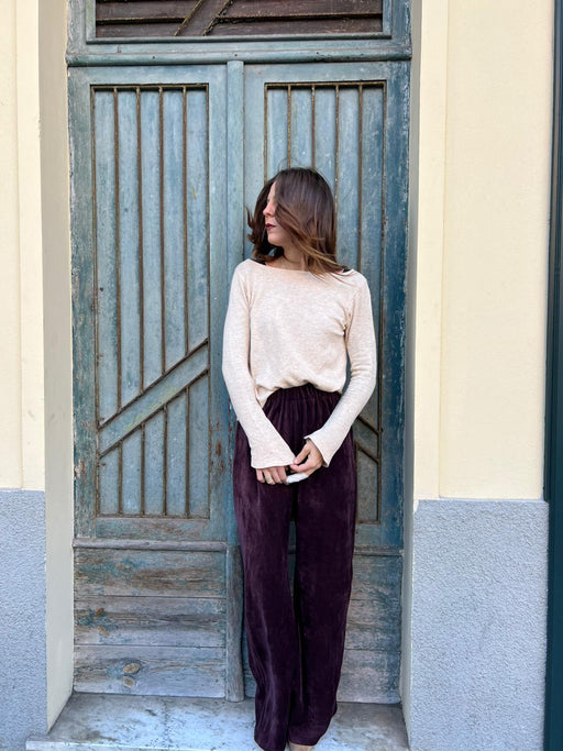 EsauritoMaglioncino leggero dal taglio leggermente svasato con collo a barchetta e manica lunga a campana.Cucito in maglina di cotone color burro mélange.C...
