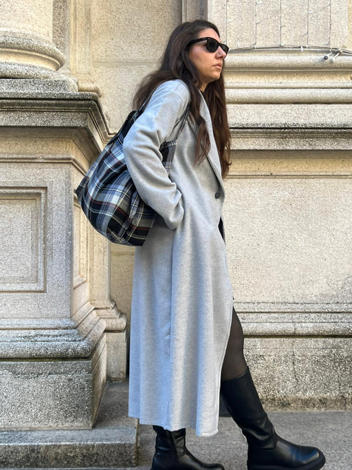 9 in magazzinoBorsa shopper con fondo rettangolare in 100% cotone fantasia tartan sui toni del nero, azzurro, rosso e bianco.Misure:- altezza 38 cm- larghezza 58...