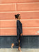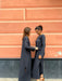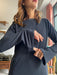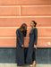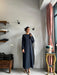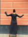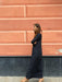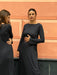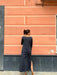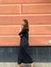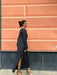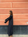 Abito lungo leggermente svasato sul fondo con spacco laterale, scollo a barchetta e maniche lunghe a campana.