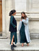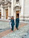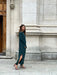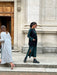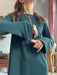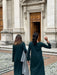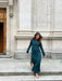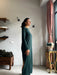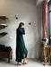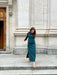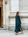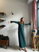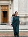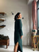 Abito lungo leggermente svasato sul fondo con spacco laterale, scollo a barchetta e maniche lunghe a campana.