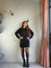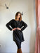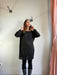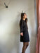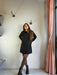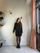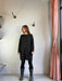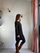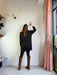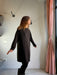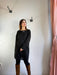 Abito al ginocchio dal taglio dritto, con scollo a barchetta e manica lunga.