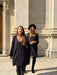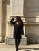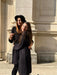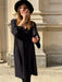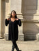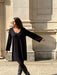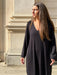 Abito midi sopra al ginocchio, dal taglio dritto con scollo a V e maniche lunghe e larghe.