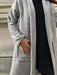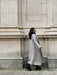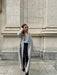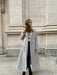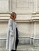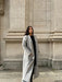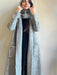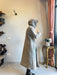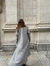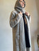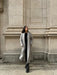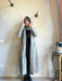 Capospalla lungo con collo a scialle, sfoderato, tasche applicate in fantasia sul davanti e passamaneria nera sul fondo.