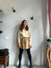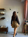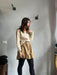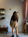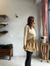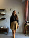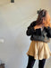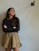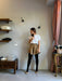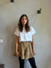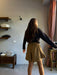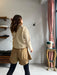 Pantagonna corto con elastico in vita e ruches sul fondo, cucito in gabardine color cammello, composizione tessuto 50% lana e 50% cotone.