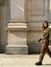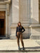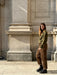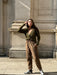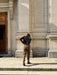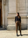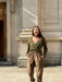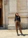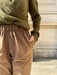 Pantalone a sigaretta (consigliato il risvolto sul fondo) con elastico in vita e tasche invisibili sui fianchi, cucito in velluto a coste color cammello.