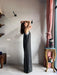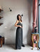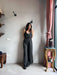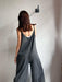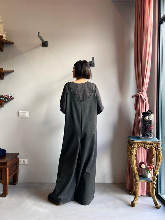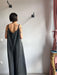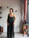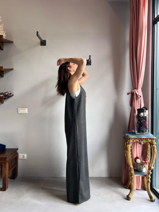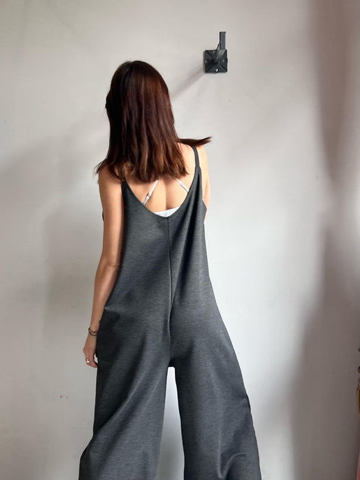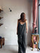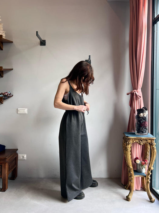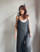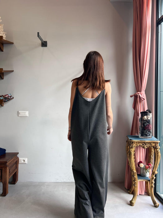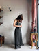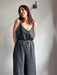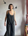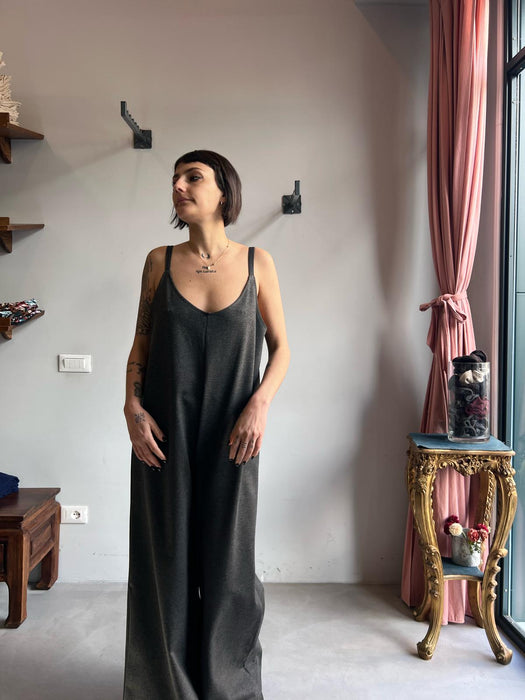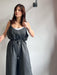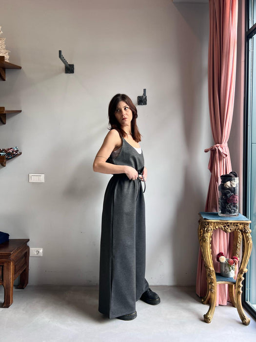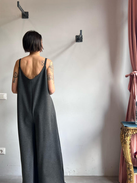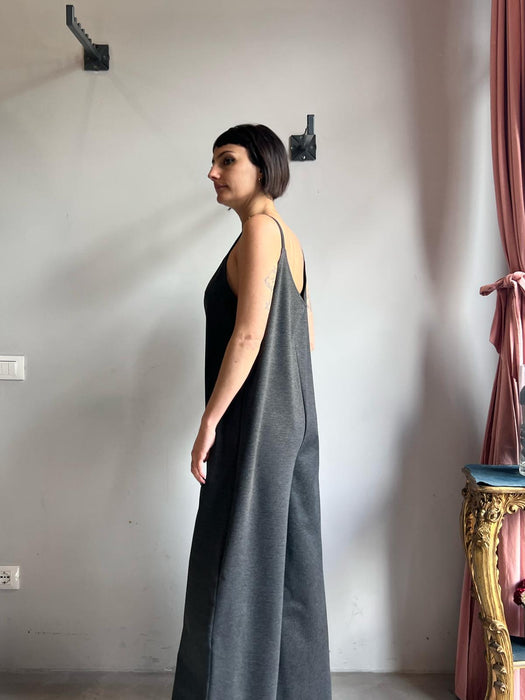 Tuta intera con pantalone a palazzo, scollo a V e spallina sottile.